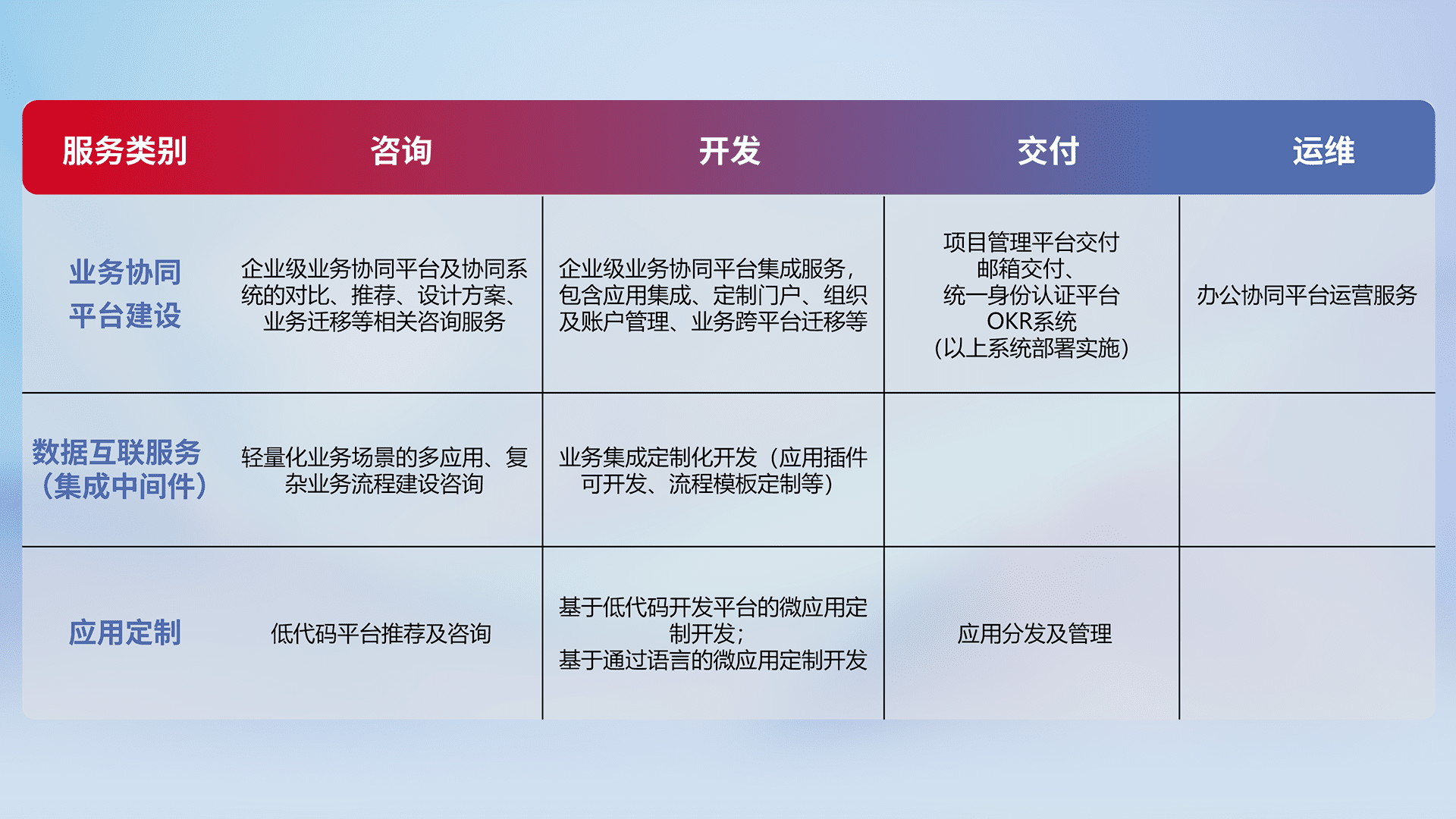 针对钉钉、、、、企微、、IDaas等平台级产品提供产品的规划、、、、方案、、、、交付、、定制化开发等服务,,,,实现如统一协同办公、、、、智能客户服务、、、、混合会议管理、、、、智能数据查询、、、、等业务场景,,,,实现数字化转型。。。